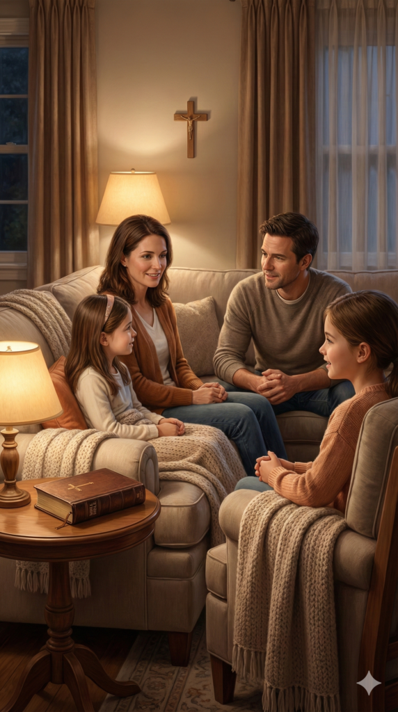 Everyday family life shaped by faith — conversations, traditions, and small moments of belief inside the home.